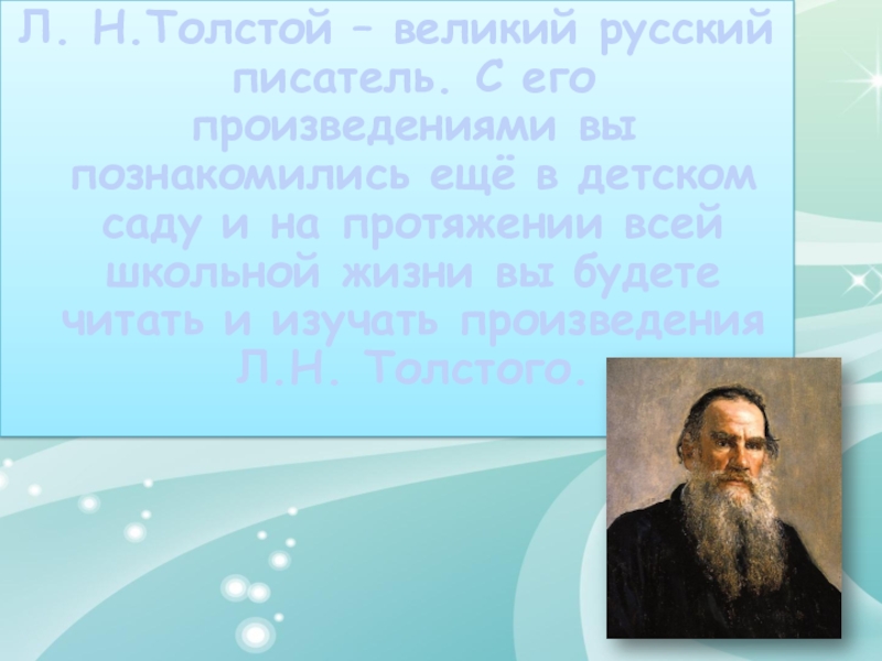 Л. Н.Толстой – великий русский писатель. С его произведениями вы познакомились ещё в детском саду и на