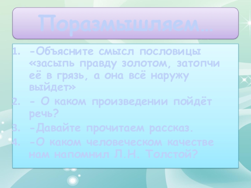 Поразмышляем…-Объясните смысл пословицы «засыпь правду золотом, затопчи её в грязь, а она всё наружу выйдет»- О каком