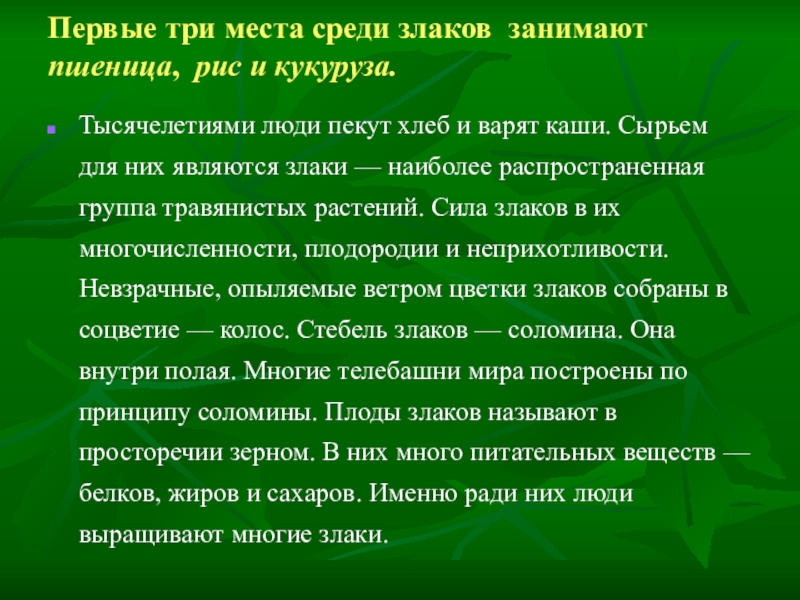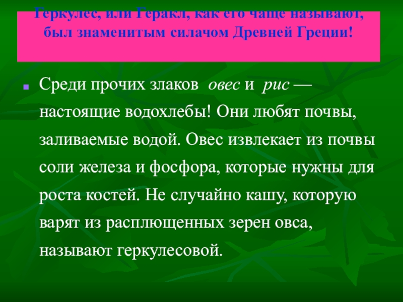 Среди прочих злаков овес и рис — настоящие водохлебы! Они любят почвы, заливаемые водой. Овес извлекает из почвы соли железа и фосфора, которые нужны для роста костей. Не случайно кашу, которую варят из расплющенных зерен овса, называют геркулесовой.