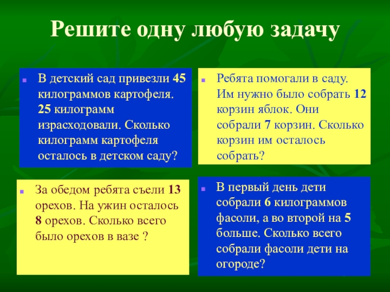 Ребята помогали в саду. Им нужно было собрать 12 корзин яблок. Они собрали 7 корзин. Сколько корзин им осталось собрать?