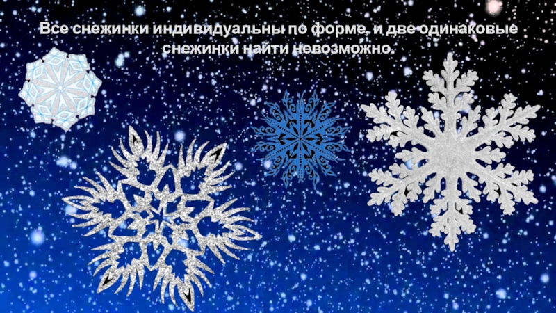 Слайд 3Все снежинки индивидуальны по форме, и две одинаковые снежинки найти невозможно.