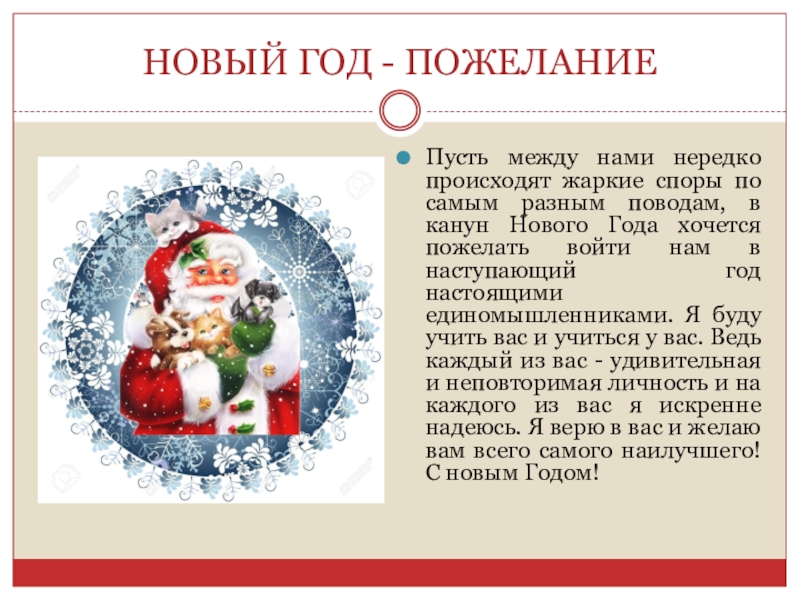 самым разным поводам, в канун Нового Года хочется пожелать войти нам в наступающий год настоящими единомышленниками. Я буду учить вас и учиться у вас. Ведь каждый из вас - удивительная и неповторимая личность и на каждого из вас я искренне надеюсь. Я верю в вас и желаю вам всего самого наилучшего! С новым Годом!