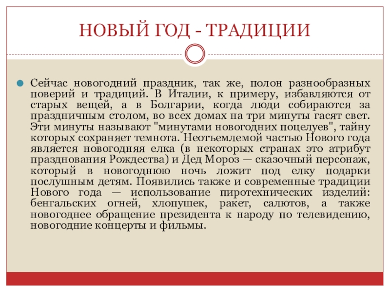и традиций. В Италии, к примеру, избавляются от старых вещей, а в Болгарии, когда люди собираются за праздничным столом, во всех домах на три минуты гасят свет. Эти минуты называют "минутами новогодних поцелуев", тайну которых сохраняет темнота. Неотъемлемой частью Нового года является новогодняя елка (в некоторых странах это атрибут празднования Рождества) и Дед Мороз — сказочный персонаж, который в новогоднюю ночь ложит под елку подарки послушным детям. Появились также и современные традиции Нового года — использование пиротехнических изделий: бенгальских огней, хлопушек, ракет, салютов, а также новогоднее обращение президента к народу по телевидению, новогодние концерты и фильмы.
