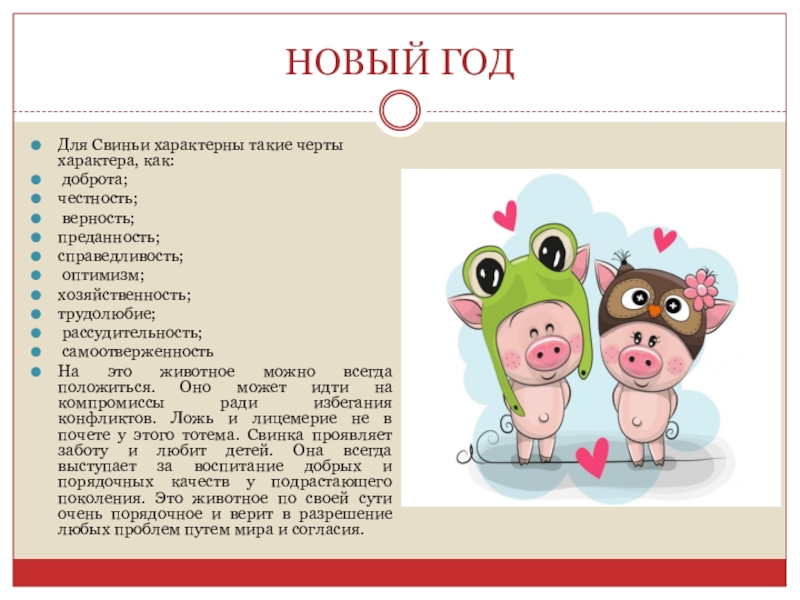 На это животное можно всегда положиться. Оно может идти на компромиссы ради избегания конфликтов. Ложь и лицемерие не в почете у этого тотема. Свинка проявляет заботу и любит детей. Она всегда выступает за воспитание добрых и порядочных качеств у подрастающего поколения. Это животное по своей сути очень порядочное и верит в разрешение любых проблем путем мира и согласия.