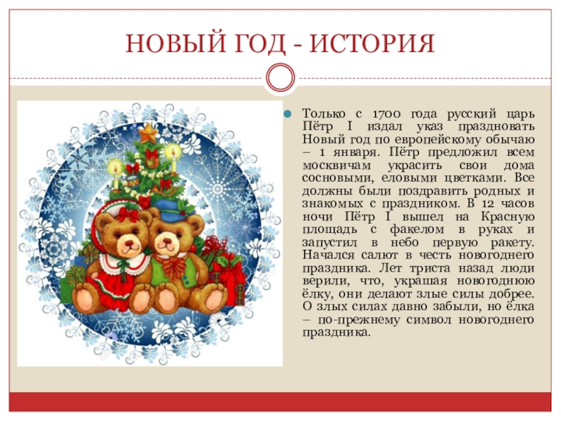 издал указ праздновать Новый год по европейскому обычаю – 1 января. Пётр предложил всем москвичам украсить свои дома сосновыми, еловыми цветками. Все должны были поздравить родных и знакомых с праздником. В 12 часов ночи Пётр І вышел на Красную площадь с факелом в руках и запустил в небо первую ракету. Начался салют в честь новогоднего праздника. Лет триста назад люди верили, что, украшая новогоднюю ёлку, они делают злые силы добрее. О злых силах давно забыли, но ёлка – по-прежнему символ новогоднего праздника.