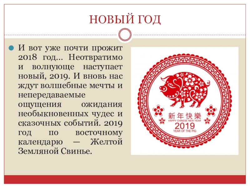 волнующе наступает новый, 2019. И вновь нас ждут волшебные мечты и непередаваемые ощущения ожидания необыкновенных чудес и сказочных событий. 2019 год по восточному календарю — Желтой Земляной Свинье.