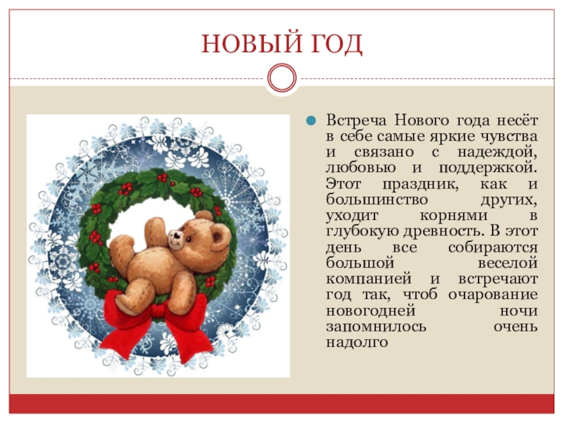 связано с надеждой, любовью и поддержкой. Этот праздник, как и большинство других, уходит корнями в глубокую древность. В этот день все собираются большой веселой компанией и встречают год так, чтоб очарование новогодней ночи запомнилось очень надолго