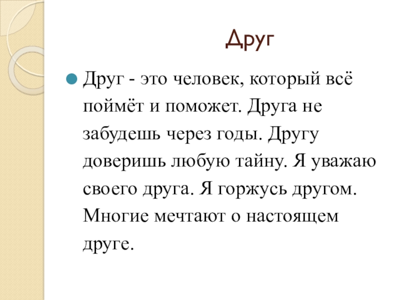 Друг - это человек, который всё поймёт и поможет. Друга не забудешь через годы. Другу доверишь любую тайну. Я уважаю своего друга. Я горжусь другом. Многие мечтают о настоящем друге.