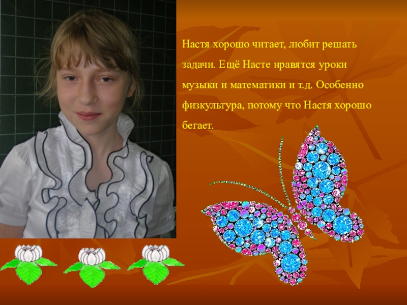Слайд 16Настя хорошо читает, любит решать задачи. Ещё Насте нравятся уроки музыки