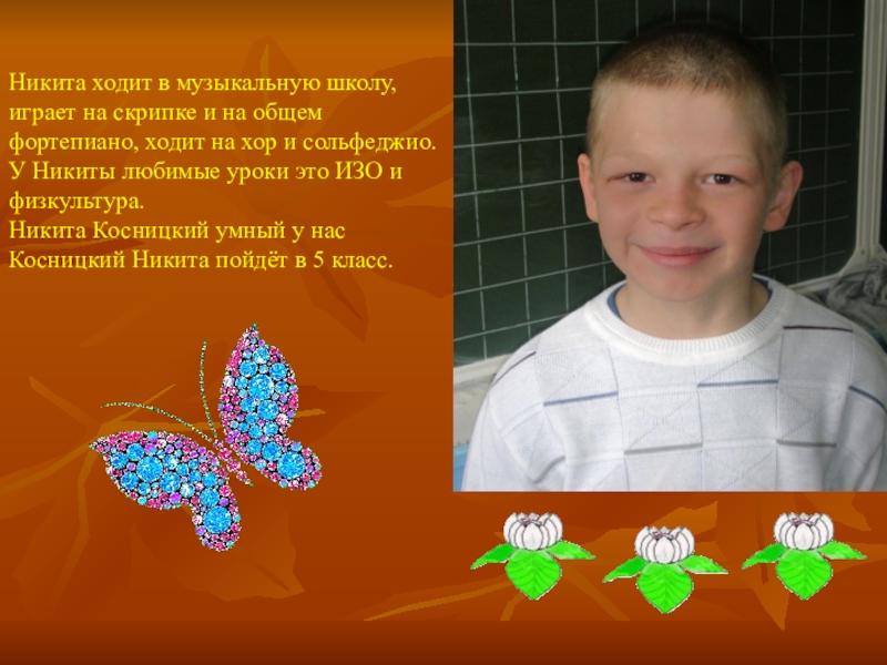 Слайд 19Никита ходит в музыкальную школу, играет на скрипке и на общем