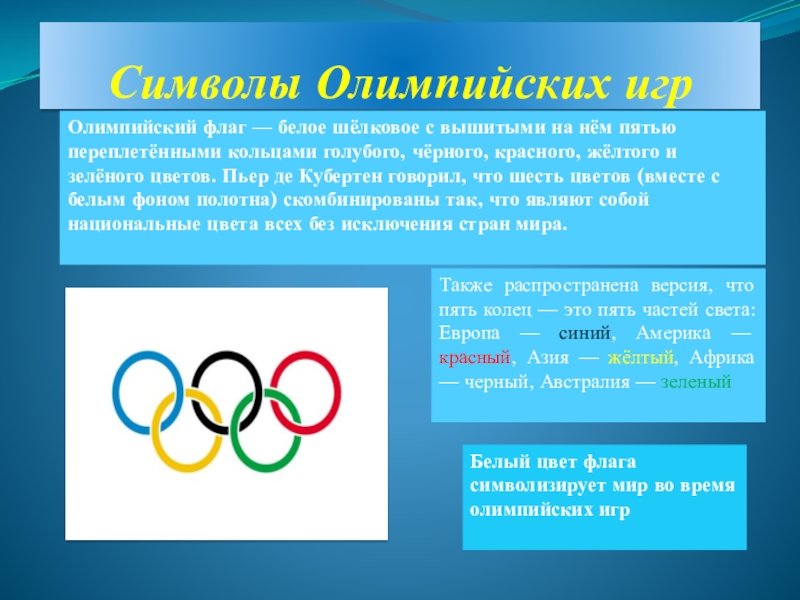 Белый цвет флага символизирует мир во время олимпийских игр