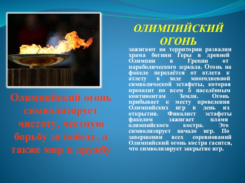 зажигают на территории развалин храма богини Геры в древней Олимпии в Греции от параболического зеркала. Oгонь на факеле передаётся от атлета к атлету в ходе многодневной символической эстафеты, которая проходит по всем 5 населённым континентам Земли. Огонь прибывает к месту проведения Олимпийских игр в день их открытия. Финалист эстафеты факелом зажигает пламя олимпийского костра. Это символизирует начало игр. По завершении всех соревнований Олимпийский огонь костра гасится, что символизирует закрытие игр.