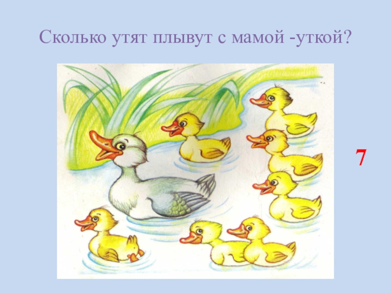 Слайд 8Сколько утят плывут с мамой -уткой?