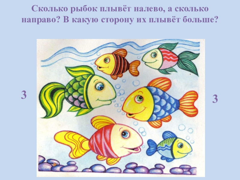 Слайд 9Сколько рыбок плывёт налево, а сколько направо? В какую сторону их