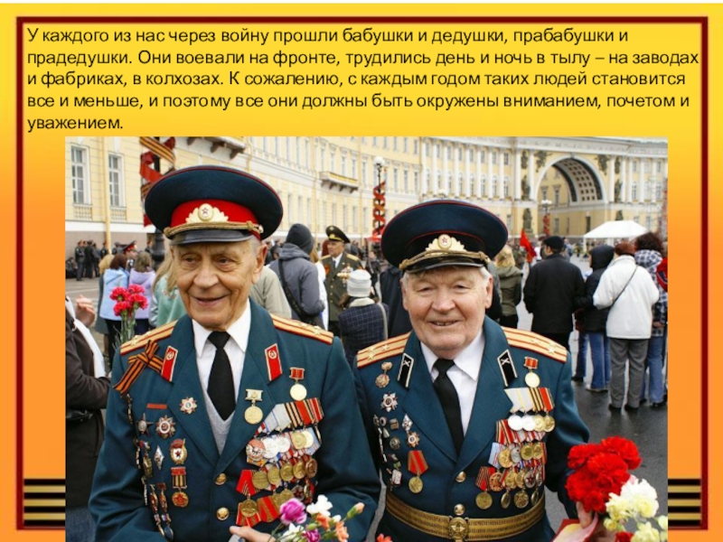 и прадедушки. Они воевали на фронте, трудились день и ночь в тылу – на заводах и фабриках, в колхозах. К сожалению, с каждым годом таких людей становится все и меньше, и поэтому все они должны быть окружены вниманием, почетом и уважением.