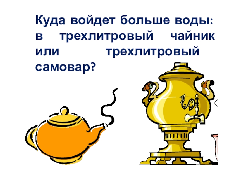 Слайд 37Куда войдет больше воды: в трехлитровый чайник или трехлитровый самовар?