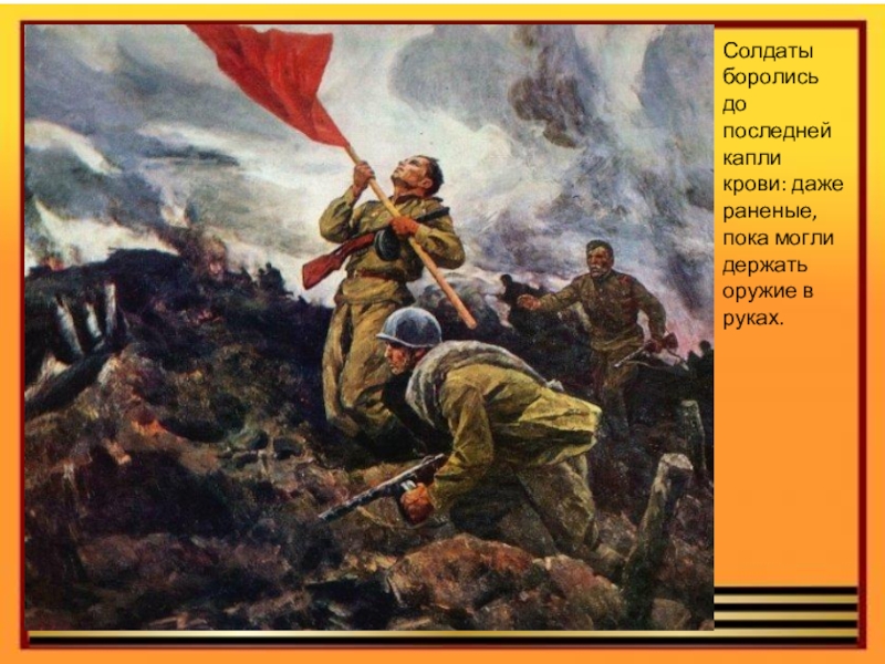 Слайд 14Солдаты боролись до последней капли крови: даже раненые, пока могли держать