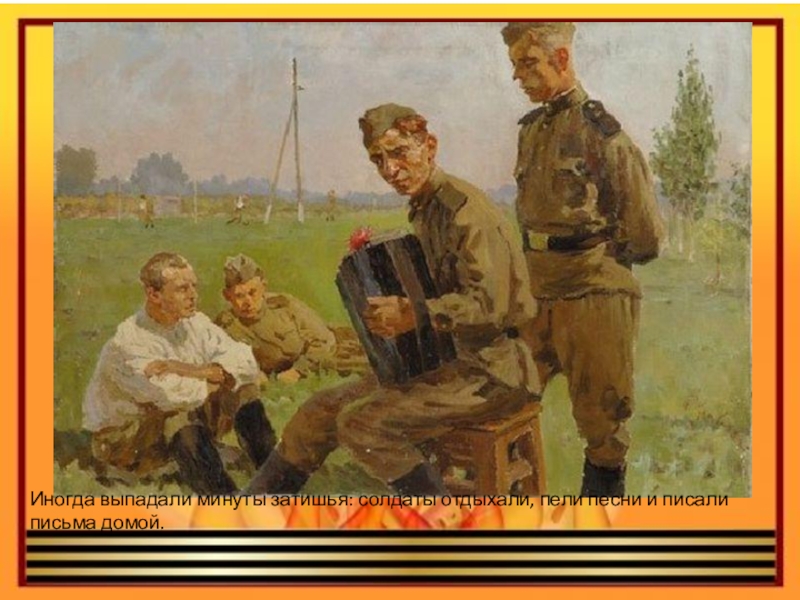 Слайд 20Иногда выпадали минуты затишья: солдаты отдыхали, пели песни и писали письма