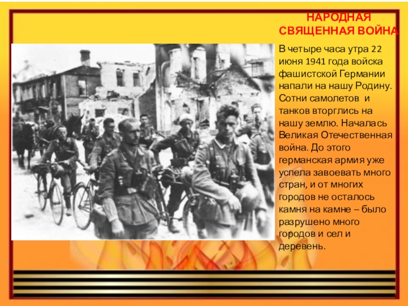 фашистской Германии напали на нашу Родину. Сотни самолетов и танков вторглись на нашу землю. Началась Великая Отечественная война. До этого германская армия уже успела завоевать много стран, и от многих городов не осталось камня на камне – было разрушено много городов и сел и деревень.