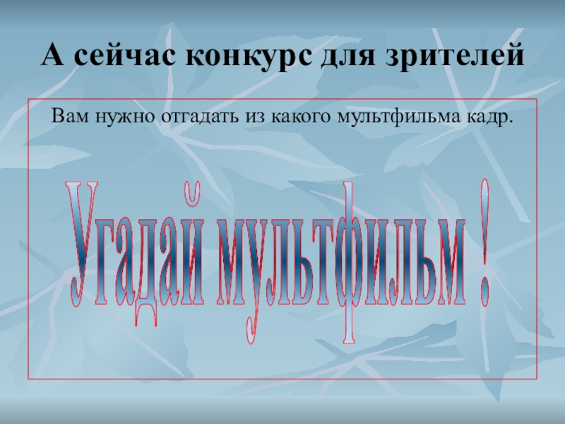 А сейчас конкурс для зрителейВам нужно отгадать из какого мультфильма кадр.Угадай мультфильм !