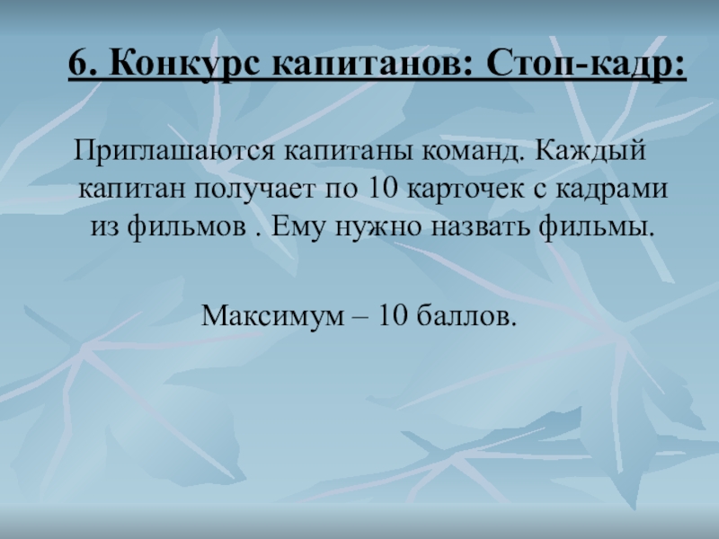 6. Конкурс капитанов: Стоп-кадр: Приглашаются капитаны команд. Каждый капитан получает по 10 карточек с кадрами из