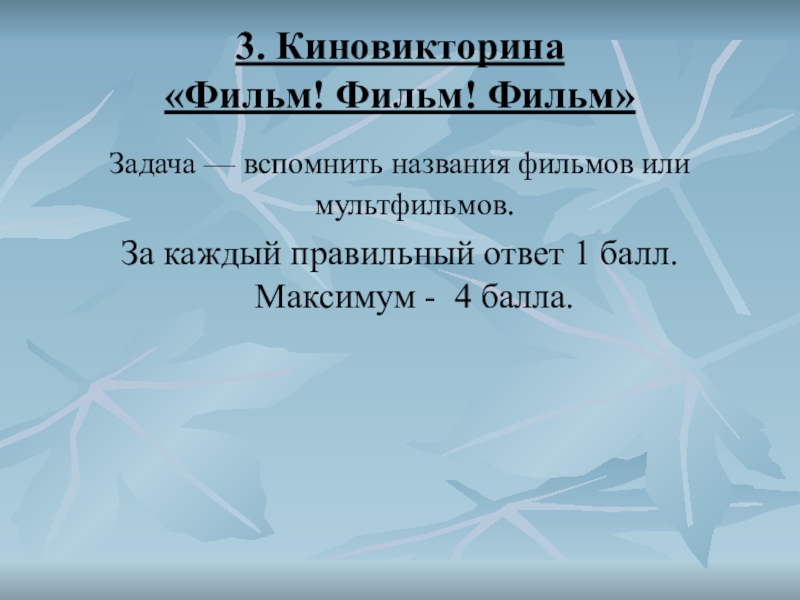 3. Киновикторина  «Фильм! Фильм! Фильм» Задача — вспомнить названия фильмов или мультфильмов.За каждый правильный ответ