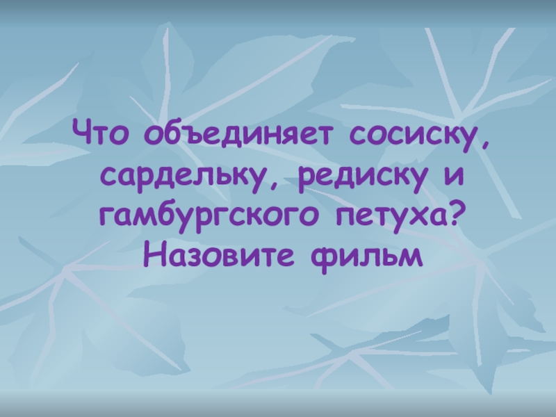 Слайд 16Что объединяет сосиску, сардельку, редиску и гамбургского петуха? Назовите фильм