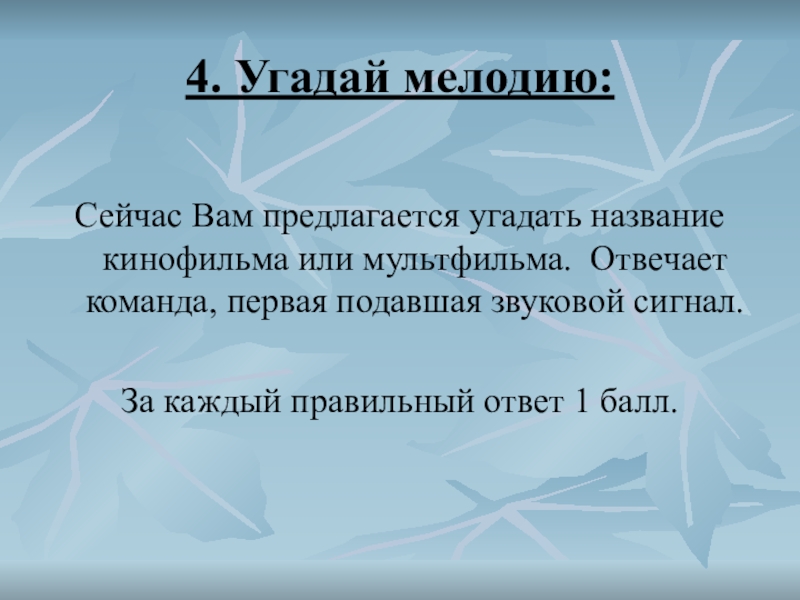 4. Угадай мелодию: Сейчас Вам предлагается угадать название кинофильма или мультфильма. Отвечает команда, первая подавшая звуковой