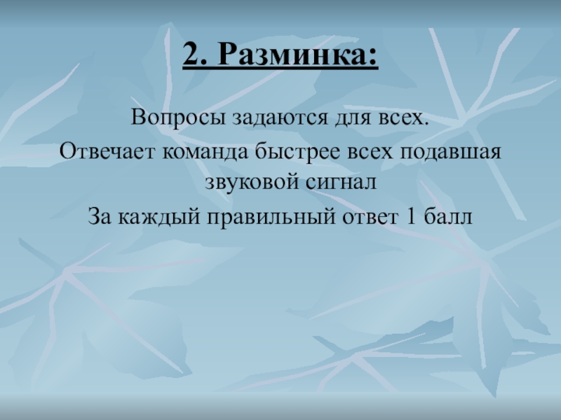 2. Разминка: Вопросы задаются для всех.Отвечает команда быстрее всех подавшая звуковой сигналЗа каждый правильный ответ 1