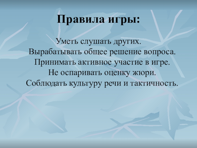 Правила игры: Уметь слушать других. Вырабатывать общее решение вопроса. Принимать активное участие в игре. Не оспаривать