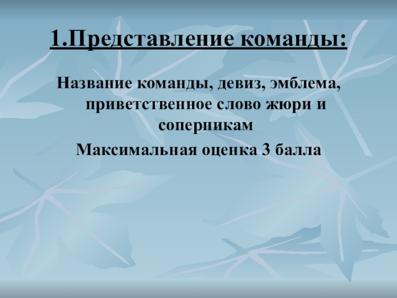 1.Представление команды: Название команды, девиз, эмблема, приветственное слово жюри и соперникамМаксимальная оценка 3 балла