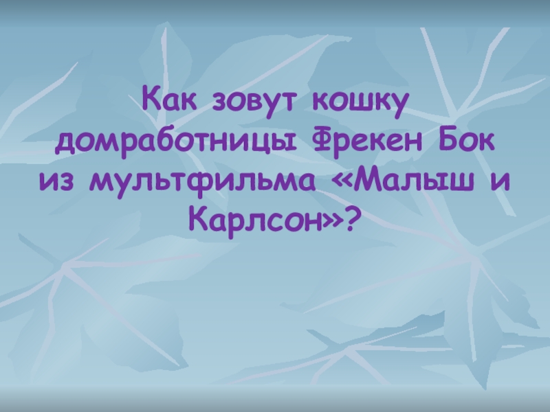 Слайд 18Как зовут кошку домработницы Фрекен Бок из мультфильма «Малыш и Карлсон»?