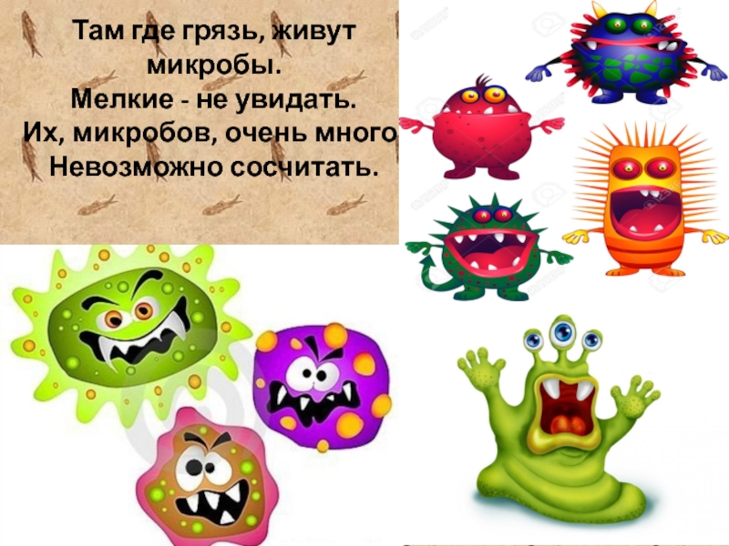 Слайд 3Там где грязь, живут микробы. Мелкие - не увидать. Их, микробов, очень много, Невозможно