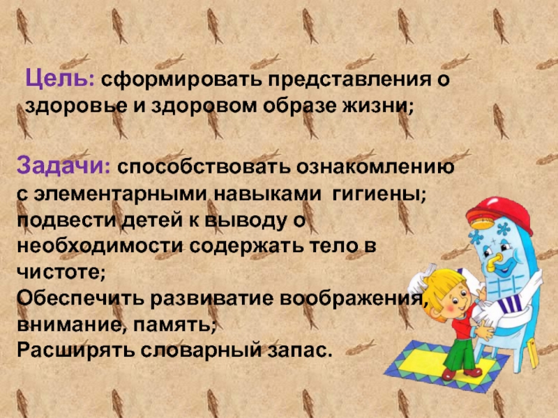 Цель: сформировать представления о здоровье и здоровом образе жизни; Задачи: способствовать ознакомлению с элементарными навыками гигиены; подвести