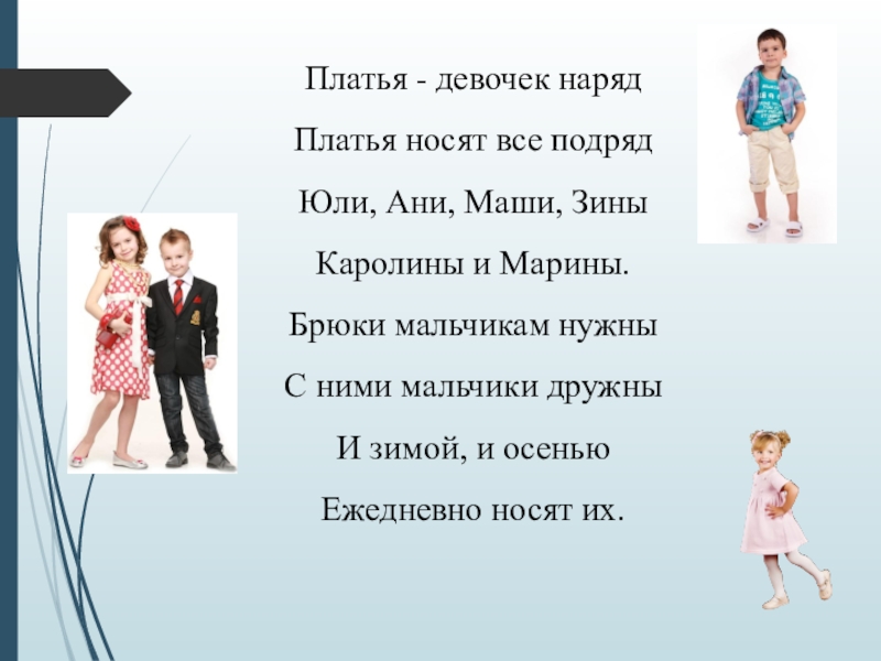 Платья - девочек нарядПлатья носят все подрядЮли, Ани, Маши, ЗиныКаролины и Марины.Брюки мальчикам нужныС ними мальчики дружныИ зимой, и осеньюЕжедневно носят их.