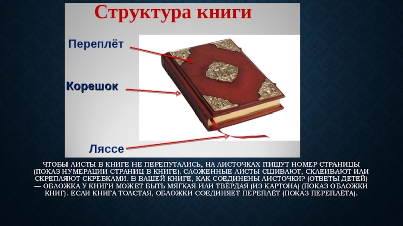 (показ нумерации страниц в книге). Сложенные листы сшивают, склеивают или скрепляют скребками. В вашей книге, как соединены листочки? (ответы детей)