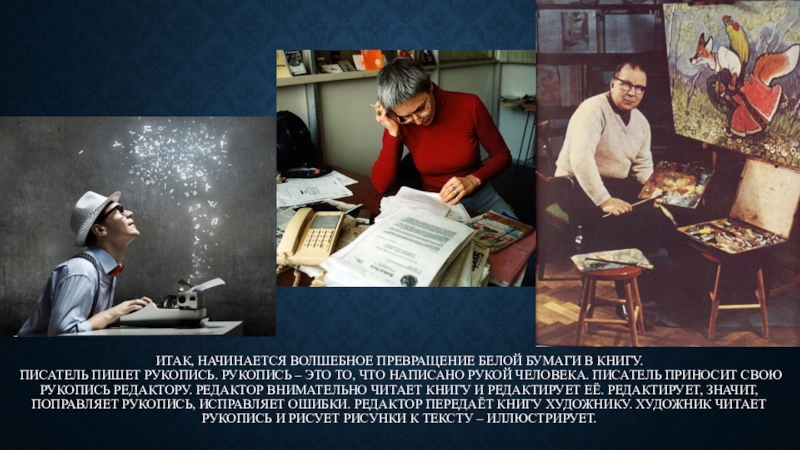 Рукопись – это то, что написано рукой человека. Писатель приносит свою рукопись редактору. Редактор внимательно читает книгу и редактирует её. Редактирует, значит, поправляет рукопись, исправляет ошибки. Редактор передаёт книгу художнику. Художник читает рукопись и рисует рисунки к тексту – иллюстрирует.