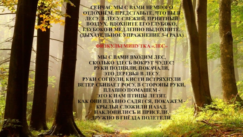 Слайд 10Сейчас мы с вами немного отдохнём. Представьте, что вы в лесу.