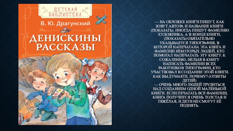 — очень много людей трудиться над созданием одной маленькой книги. Если печатать все фамилии, книга получится очень толстая и тяжёлая, и дети не смогут её поднять.