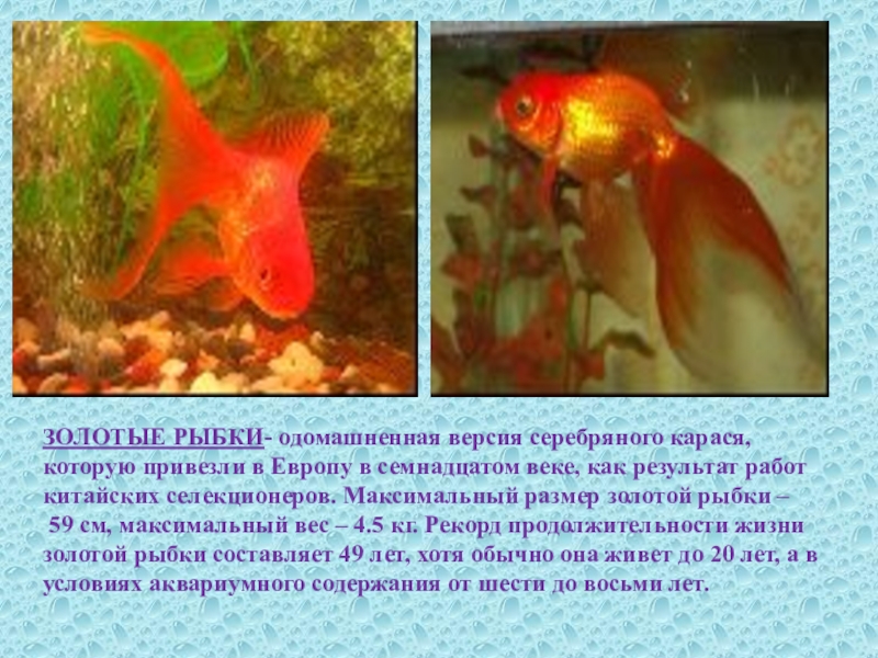 Слайд 10ЗОЛОТЫЕ РЫБКИ- одомашненная версия серебряного карася, которую привезли в Европу в