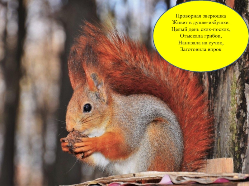 Слайд 2Проворная зверюшка Живет в дупле-избушке. Целый день скок-поскок, Отыскала грибок, Нанизала на сучок, Заготовила впрок