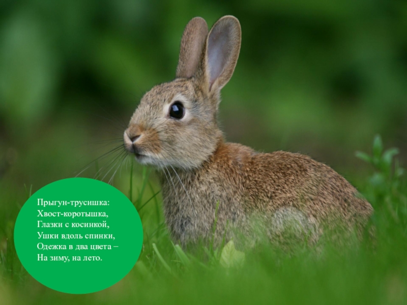 Прыгун-трусишка: Хвост-коротышка, Глазки с косинкой, Ушки вдоль спинки, Одежка в два цвета – На зиму, на лето.