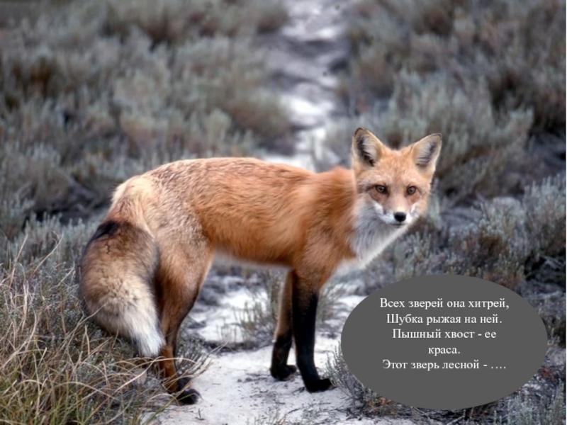 Слайд 12Всех зверей она хитрей, Шубка рыжая на ней. Пышный хвост - ее краса. Этот