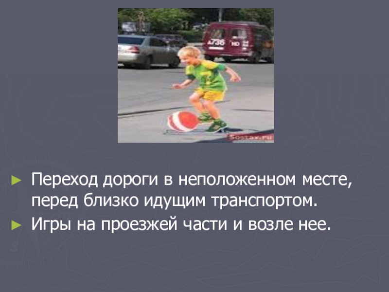 Переход дороги в неположенном месте, перед близко идущим транспортом. Игры на проезжей части и возле нее.