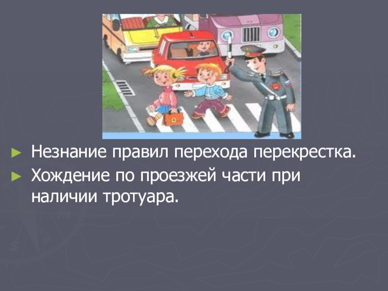 Незнание правил перехода перекрестка. Хождение по проезжей части при наличии тротуара.