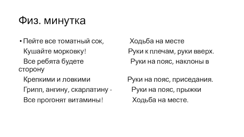 Физ. минуткаПейте все томатный сок,        Ходьба на месте  Кушайте