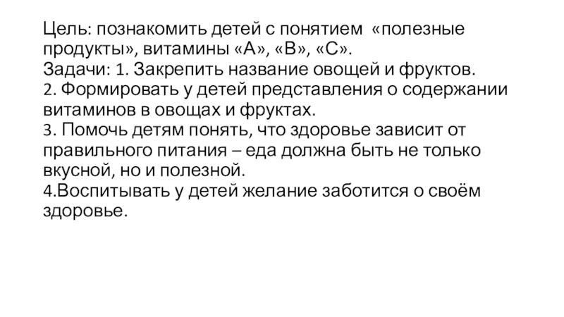 Цель: познакомить детей с понятием «полезные продукты», витамины «А», «В», «С». Задачи: 1. Закрепить название овощей и