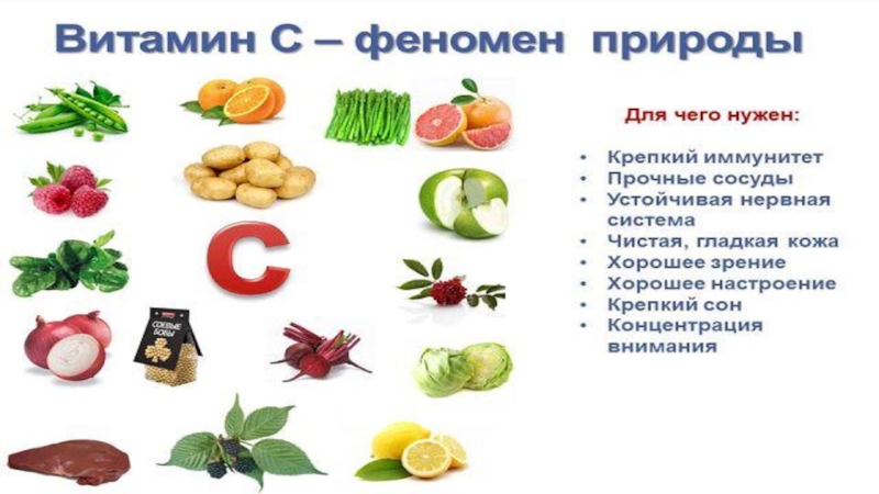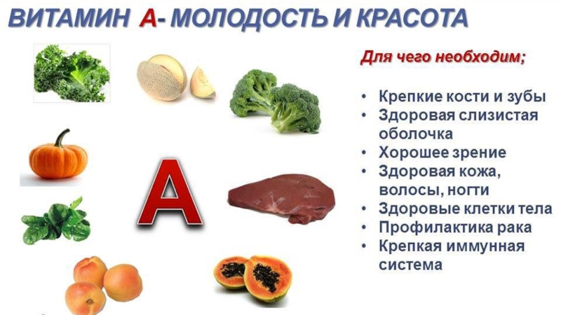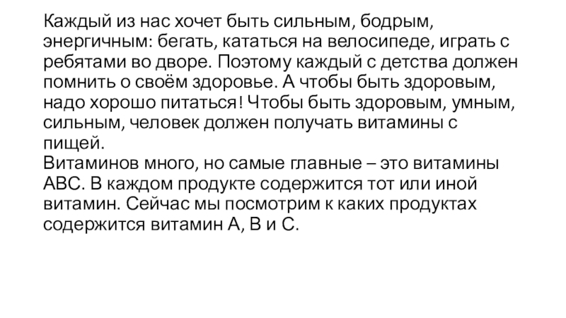 велосипеде, играть с ребятами во дворе. Поэтому каждый с детства должен помнить о своём здоровье. А чтобы быть здоровым, надо хорошо питаться! Чтобы быть здоровым, умным, сильным, человек должен получать витамины с пищей. Витаминов много, но самые главные – это витамины АВС. В каждом продукте содержится тот или иной витамин. Сейчас мы посмотрим к каких продуктах содержится витамин А, В и С.