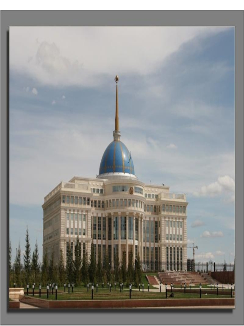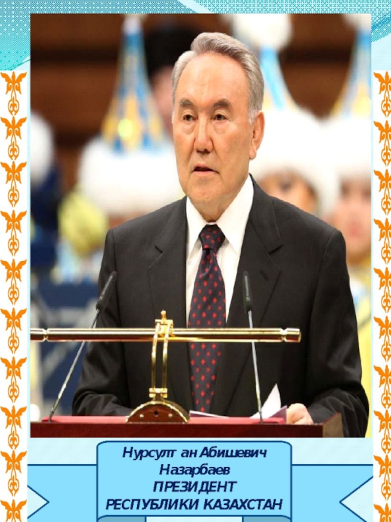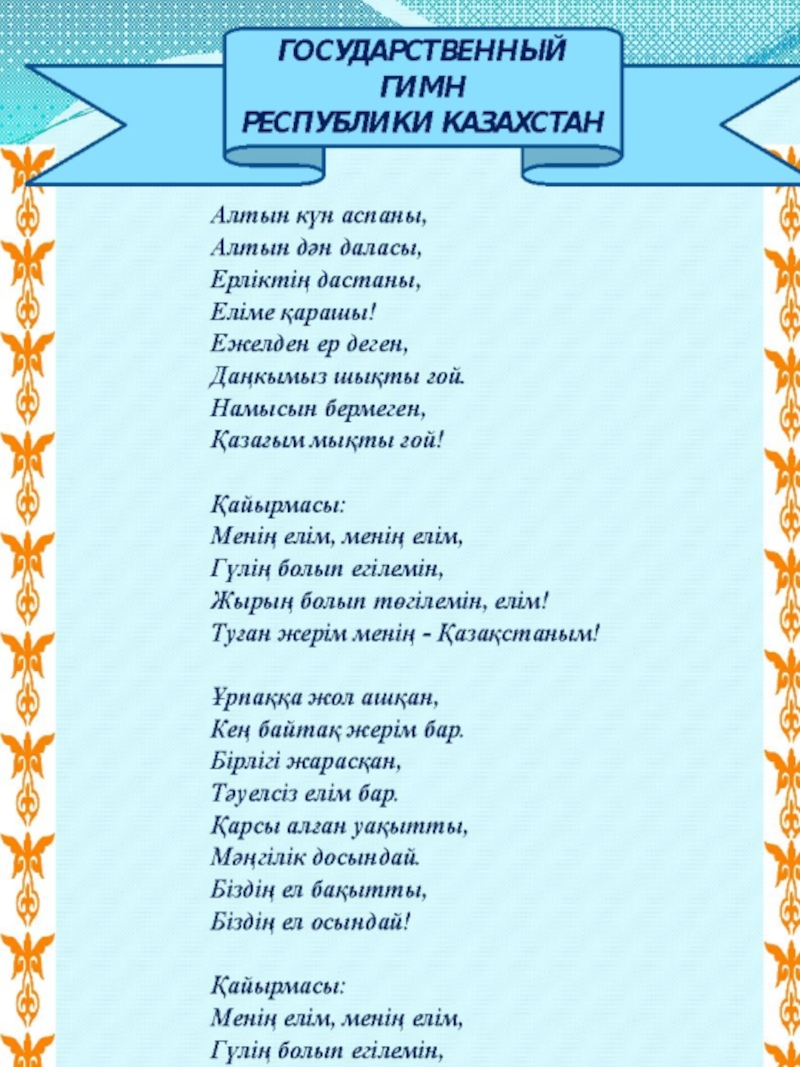флага напоминает чистое, безоблачное небо. Золотое солнце обозначает покой и богатство. Орёл, который распростёр крылья, символ власти, независимости, свободы. На флаге около древка есть полоска из элементов казахского орнамента.