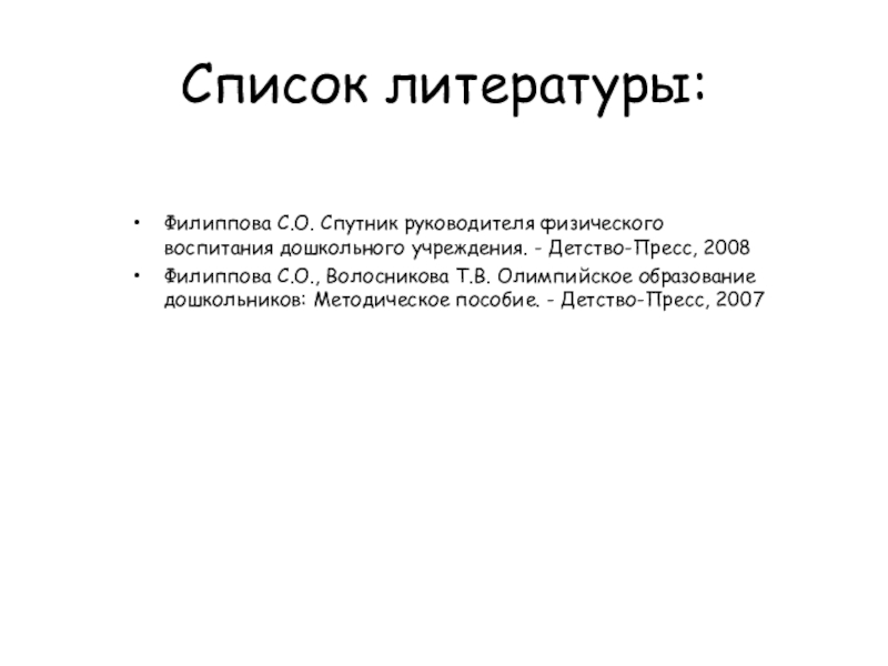 Список литературы:Филиппова С.О. Спутник руководителя физического воспитания дошкольного учреждения. - Детство-Пресс, 2008Филиппова С.О., Волосникова Т.В. Олимпийское образование